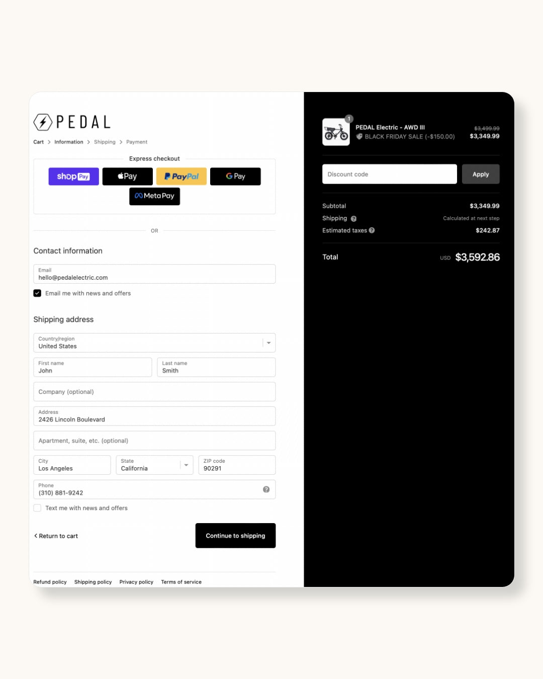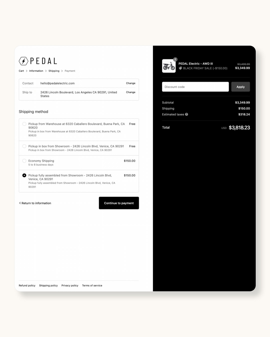 Once you begin the checkout process you will be asked to fill out your contact info. Once completed continue to shipping.