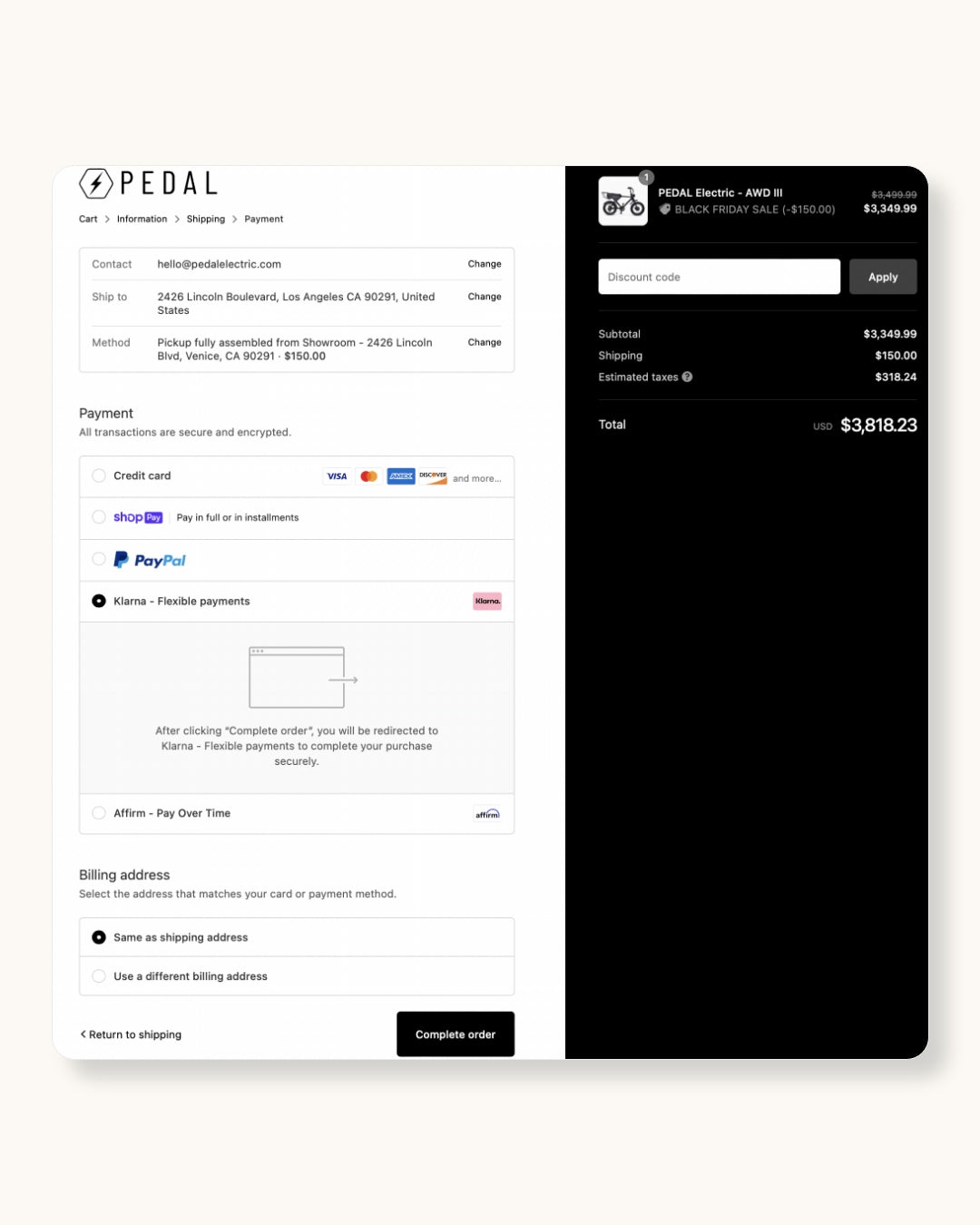 It is here that you may select either Klarna or Affirm (feel free to explore other payment options as well from ShopPay or Paypal). Once selected and "Complete Order" has been pushed you will be directed to the pay over time platform checkout flow to finish your order.