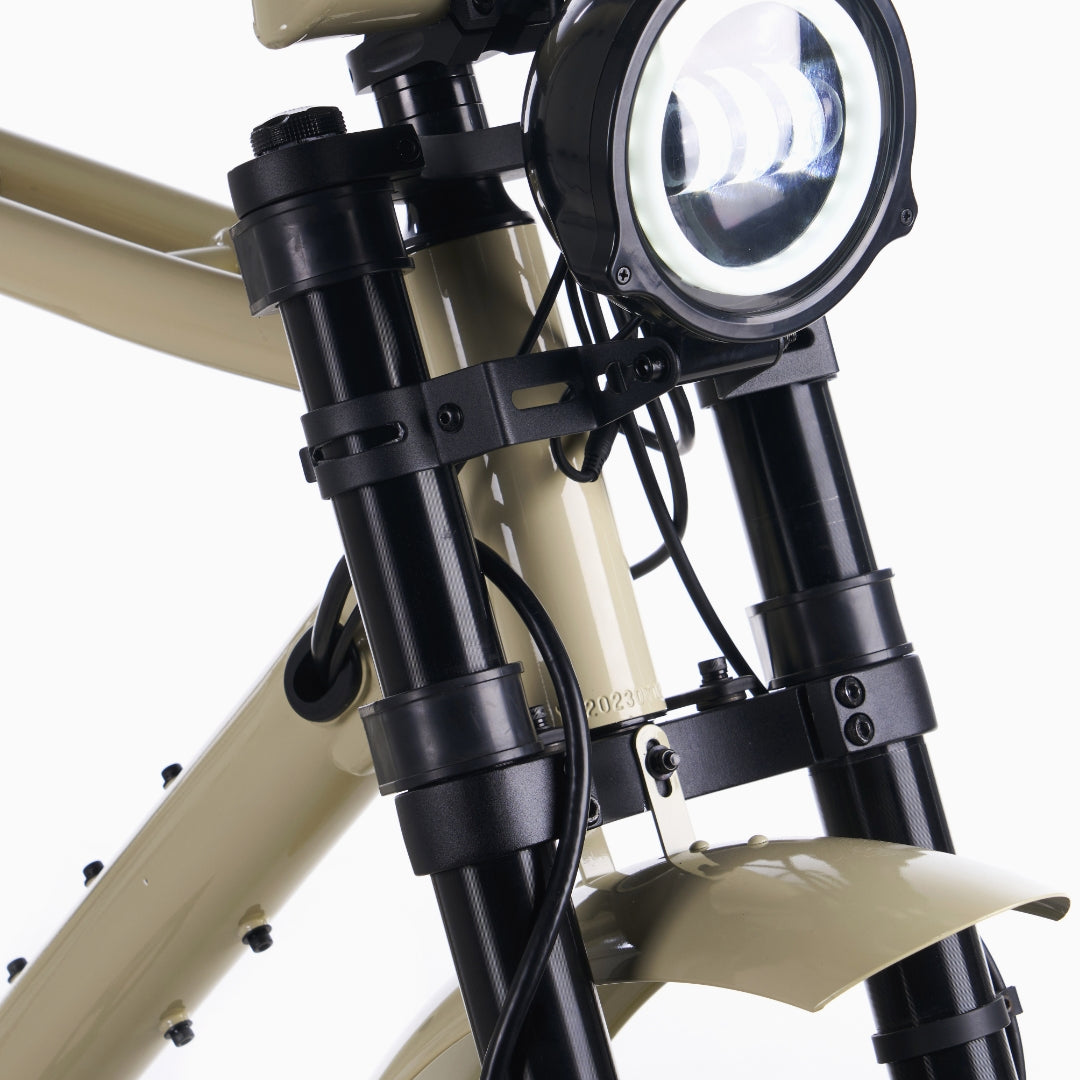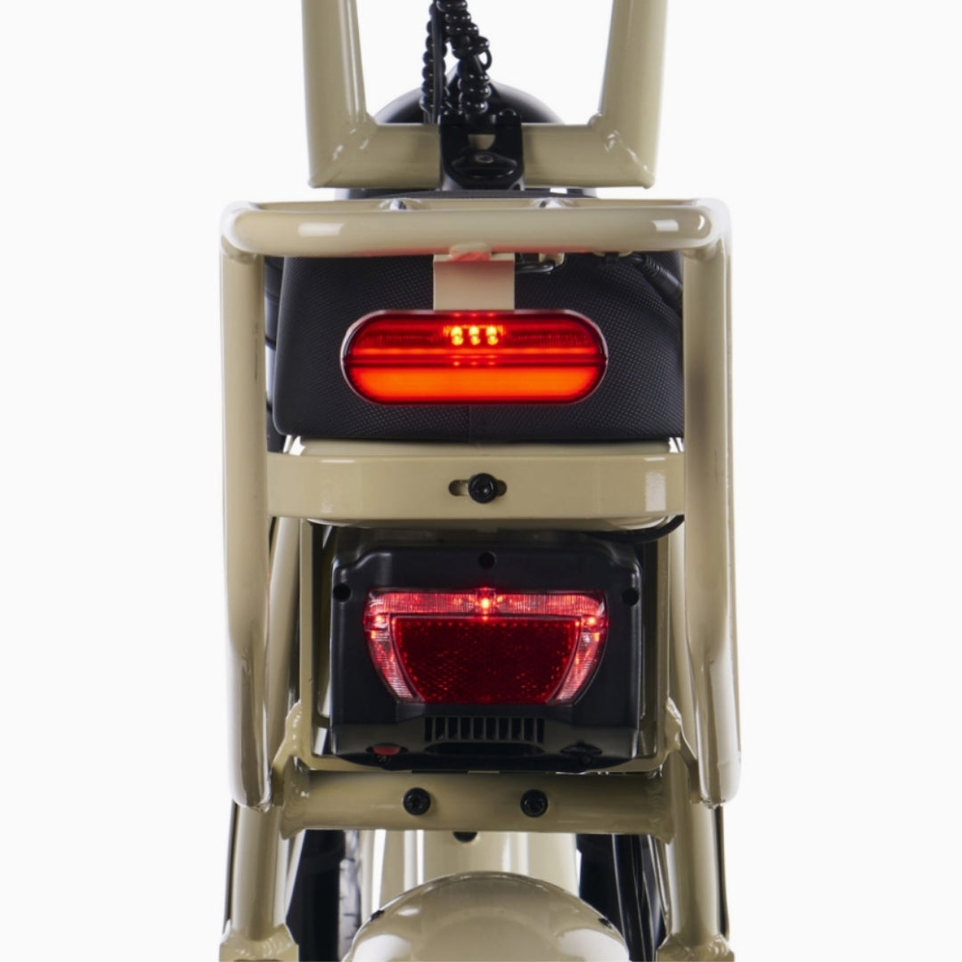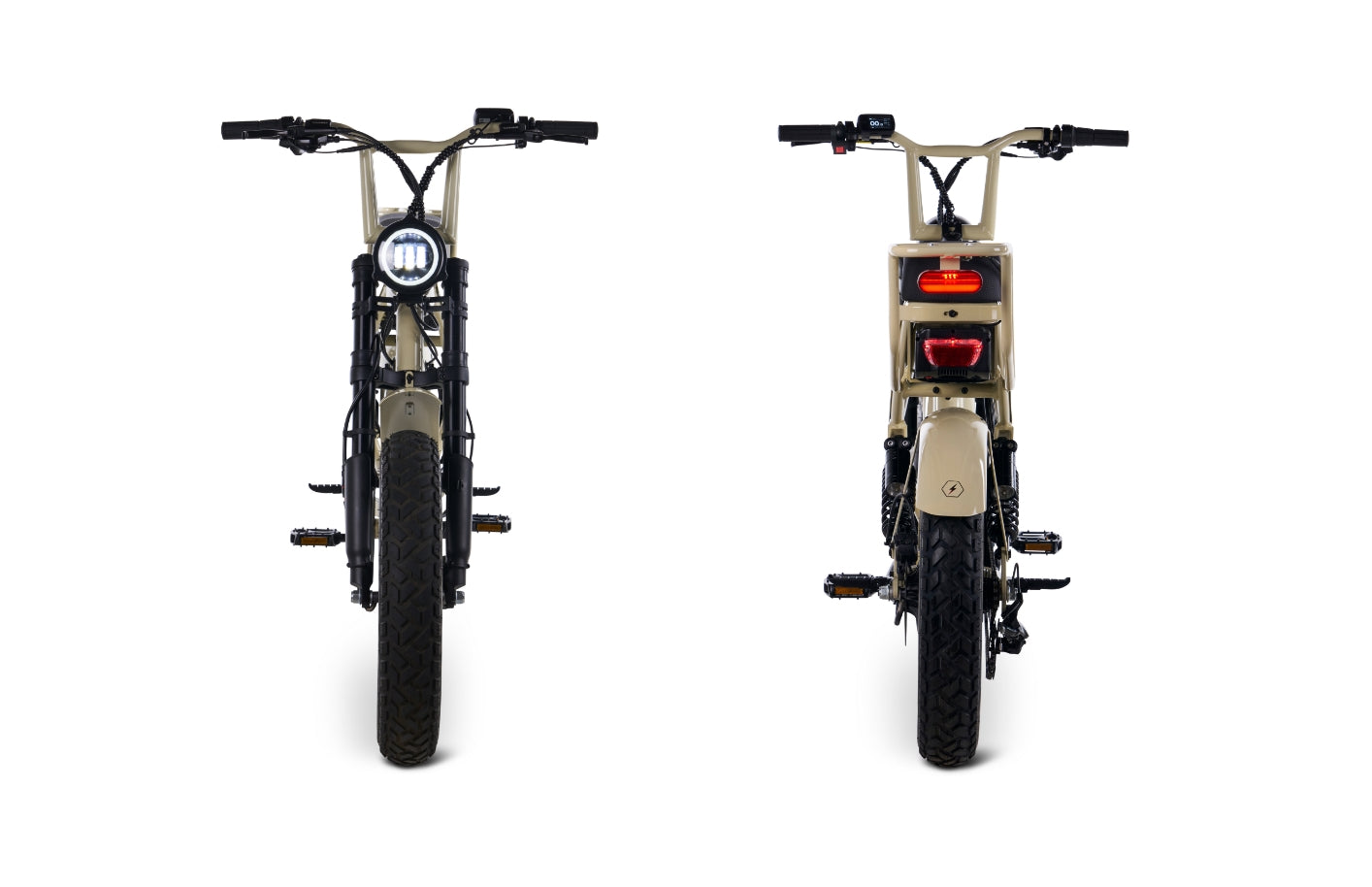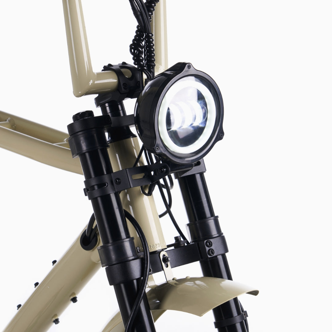 Featuring a front halo headlight allowing both dim and bright settings. Integrated taillight with brake light and turn signal brightener
